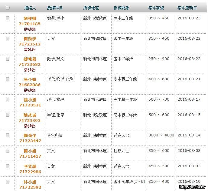 2.搜尋理想地區、科目後,注意家長需求如:須不須試教、附帶條件等等,電話聯繫或投遞履歷
