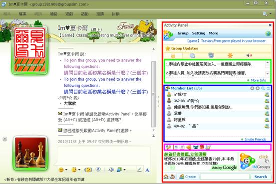 8. 點選『接受』後會出現一個 Activity Panel , 如下圖紅色框, 其中綠色框是社群公告, 藍色框為社群名單, 紫色框則為功能表。