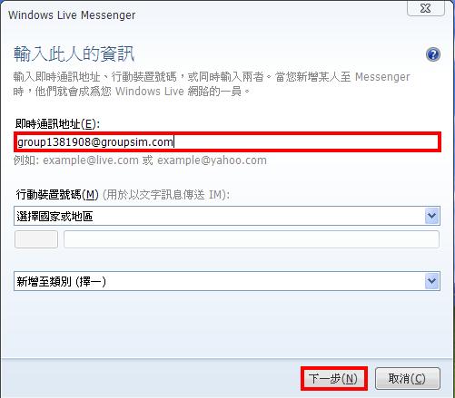 3. 輸入『group1381908@groupsim.com』後, 按下一步。