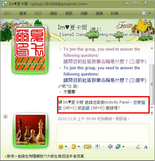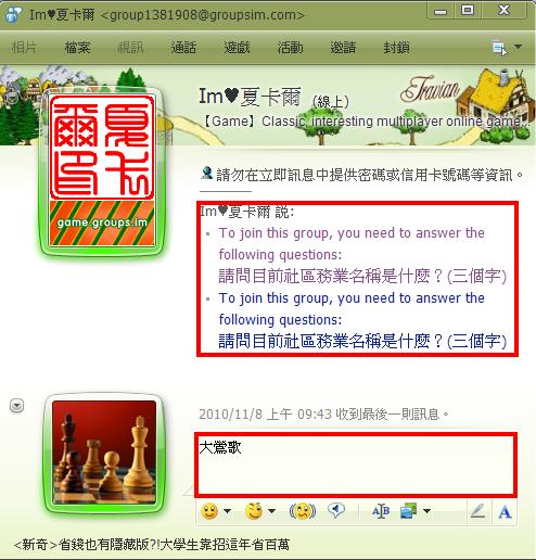 6. 會看到一個對話視窗, 由『Im♥夏卡爾』傳送過來的, 並出現問題『請問目前社區務業名稱是什麼?(三個字)』屆時請輸入正確答案『大鶯歌』否則將加入失敗, 必須重新加入。