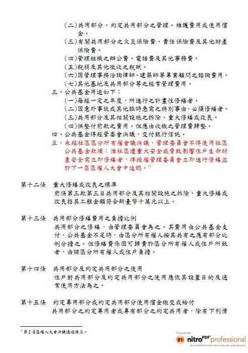 五、未經社區區分所有權會議決議,管理委員會不得使用社區公共基金款項;惟社區遭重大安全威脅致