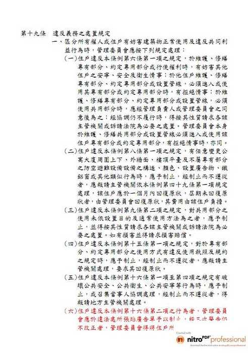 (六)住戶違反本條例第十六條第二項之行為者,管理委員會應於違法處所張貼廣告單予以制止,經三次警