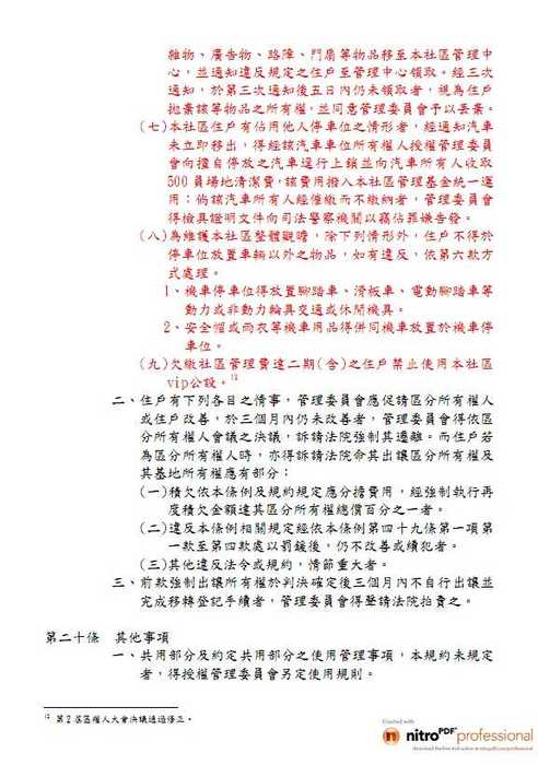 (八)為維護本社區整體觀瞻,除下列情形外,住戶不得於停車位放置車輛以外之物品,如有違反,依第六