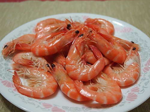 我家的蝦子都是船上直接撈起就活凍的, 不用退太久, 我都是冷凍拿出來, 直接自來水上沖2分鐘, 冰塊一掉, 就丟到開水中煮一下下, 然後顏色變紅, 就馬上撈起. 最新鮮,最自然.最多沾個醬油就可以了.