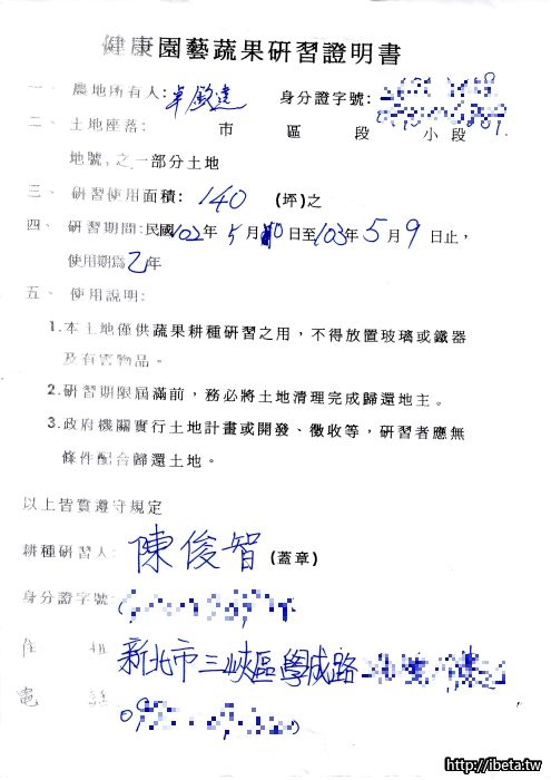 很高興認識大家!我們合租的農地目前還有一些細節問題,這周三跟地主討論過後也會在這裡跟大家公布,請大家都進來這邊報到,等跟地主討論好之後就會推選代表先簽約,然後選出管理人,至於還有一小部分坪數,如果到簽約那天還沒有人確認要的,我們再來討論看是要大家再分攤還是等其他人加入,都可以.