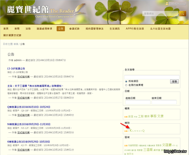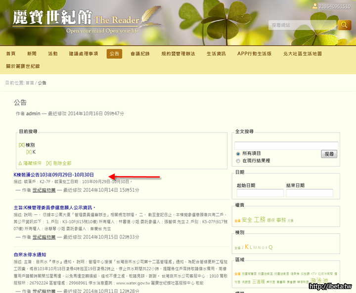 這樣就能看見K棟所有的公告囉(依照時間反向排序,亦即越新的公告在越上頭)。