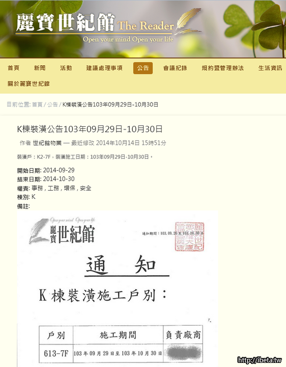 從裝潢公告的名稱與描述就可清楚知道裝潢棟別及施工申請日期。