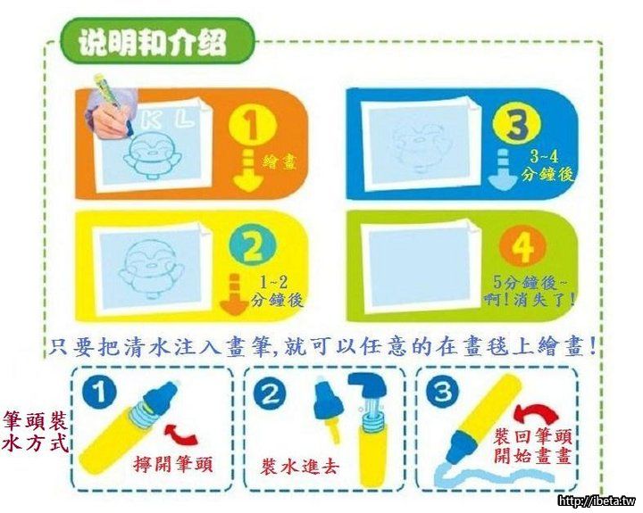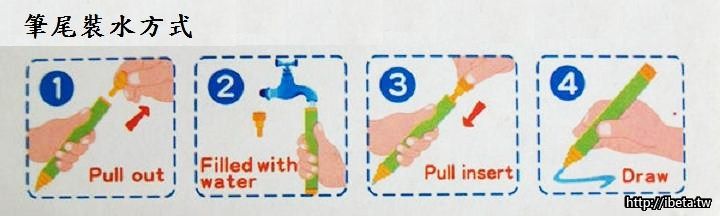 再裝自來水或飲用水使用,這樣出水就會更流暢)水筆所畫之處即立刻出現繪畫筆迹。