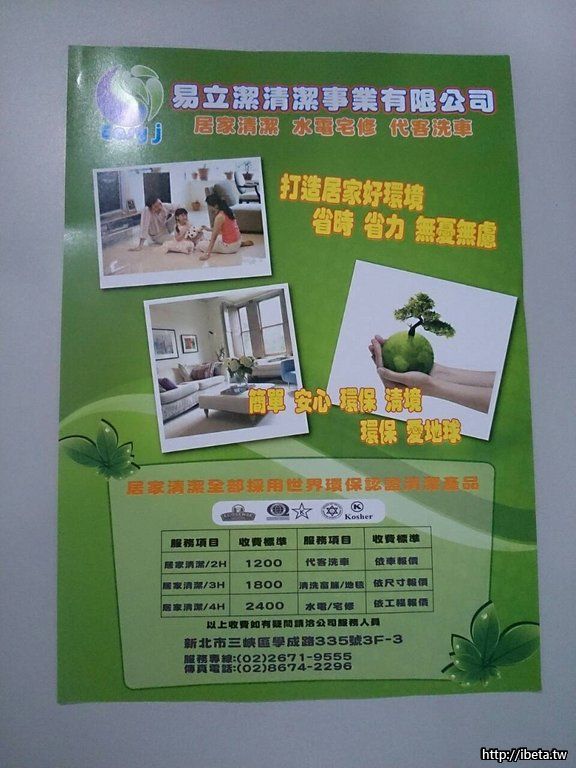 易立潔清潔事業有限公司.成立於三峽北大.,由最初本業不動產拓展業務至清潔公司,員工數近50名,由於仿間皆為跑單幫.對於居家清潔後續服務.客戶安全等問題.都須由公司替您把關.簡單.安心.環保.清境.環保.愛地球.內部管理主要由2部門相互分工,設置有 1.清潔部-清潔經理.清潔組長.清潔業務,2.奈米防護部-防護經理.行銷業務.防護專員.我們認為,各行業在其最初發展階段,都容易受限於客戶來源取得不易之難,及售後服務之追蹤.故每個時期都影其階段性任務,從交屋清潔步入奈米防護保養,水電宅修.代客洗車.再逐漸深入大型契約客戶,以至近期參與公家單位標案.....易立潔本著環保理念 居家清潔用品全部採用世界環保認證清潔產品.