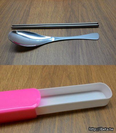 兩件式餐具組(不鏽鋼筷子*1雙、湯匙*1 及耐熱塑料餐具盒*1 )。