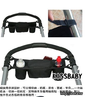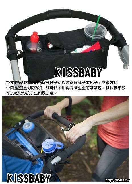掛在嬰兒推車後的托盤式袋子,可以裝兩個杯子或瓶子,拿取方便,中間是拉鏈式收納袋,媽咪們不用再背著重重的媽媽包,推個推車就可以輕鬆帶孩子出門散步囉。
