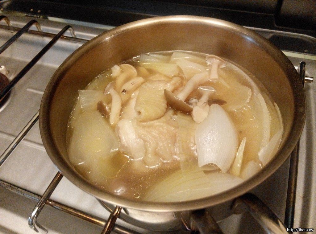 STEP 2. 川燙後的雞腿肉,連同洋蔥、鴻喜菇...等等隨興不拘,合口味就好。主角是啤酒,為何要用啤酒?不是愛喝酒,而是啤酒酵素有化骨綿掌的功效,可縮短燉煮時間,就可使之骨肉分離。再則,現成的麥香甜味,湯都不用添加任何調味料,對於野炊甚是便利,且風味獨特!(燉煮後毫無酒精,不喜飲酒者亦可)