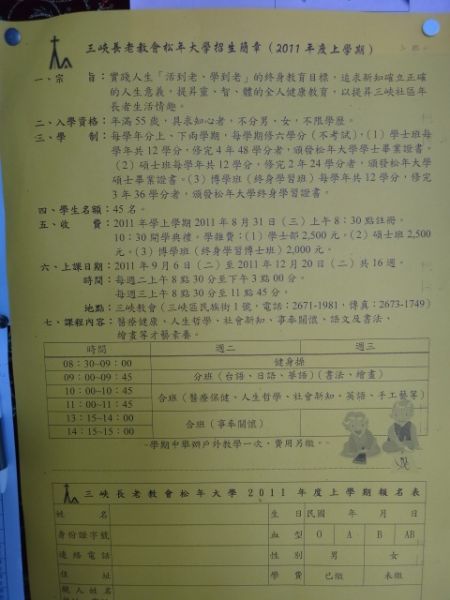 課程內容: 醫療保健,人生哲學,社會新知,書法,繪畫,英語,手工藝