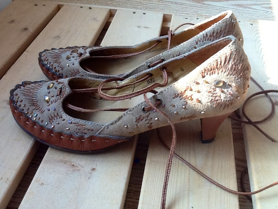 [二手買賣] 卡其色麂皮民族風綁帶跟鞋 #38