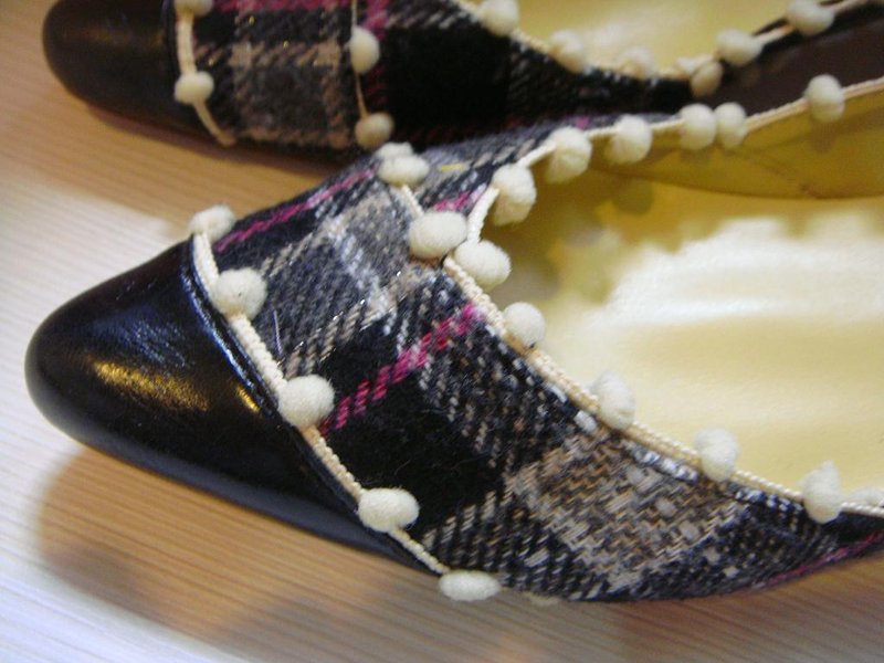 [二手買賣] 毛球飾邊 格紋黑色尖頭低跟包鞋