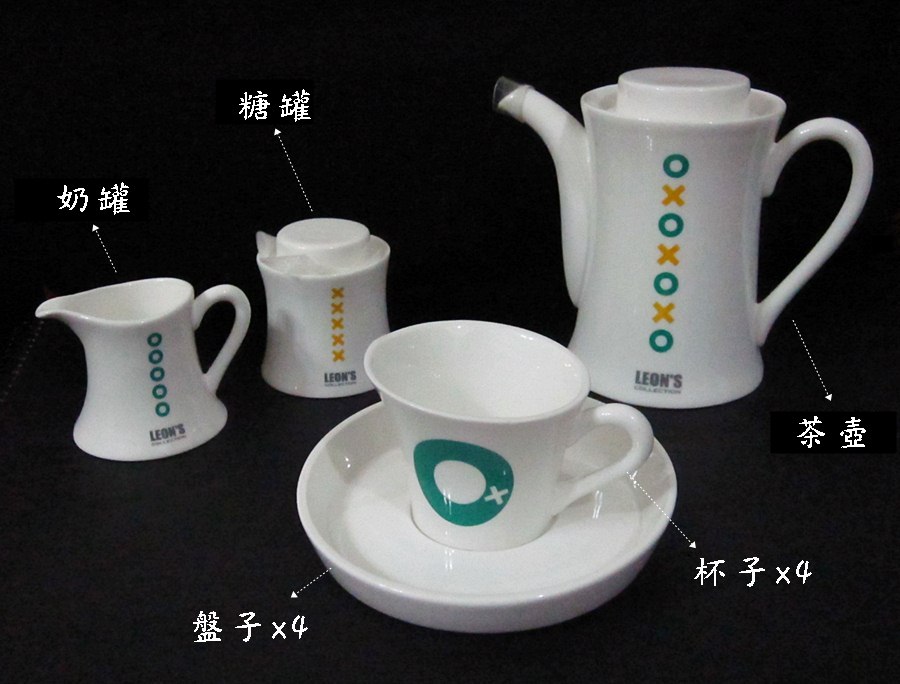 內有 : 茶壺 x 1 , 茶杯 x 4, 盤子 x 4, 糖罐 x 1 , 奶罐 x 1