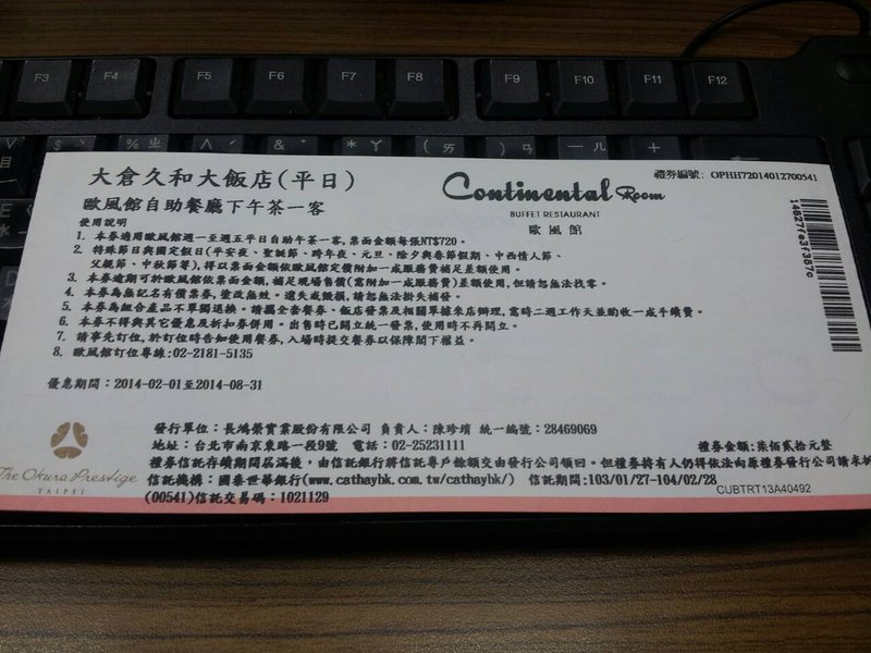 [二手買賣] 大倉久和飯店 歐風館自助餐廳下午茶券