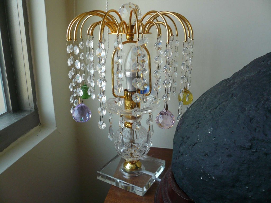 在家放在角落約近一年.正常使用.無破損.幾個月前才換了LED燈泡.可正常點燃.因為是奧地利正統水晶.所以看起來非常晶瑩剔透.就算髒了只要用布擦一下就可.點亮後很華麗.加上五種顏色水晶點綴.就算白天也很美.尺寸約22*35cm左右.當初買價部便宜.現在便宜割愛只要2900.