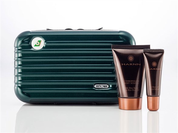 RIMOWA過夜包所使用的材質,也與行李箱有相同品質,搭配長榮航空專屬的RACING GREEN顏色及泰國SPA第一品牌HARNN的乳液與護唇膏,顯得相當具有質感與獨特。