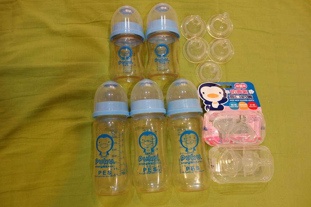 [二手買賣] 很新的藍色企鵝寬口奶瓶3大2小+全新奶嘴 |