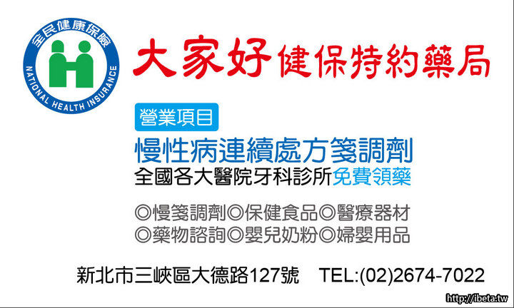 TEL:0226747022 大家好藥局學成店 新北市三峽區學成路291號 TEL:0226741538 慢性病處方簽調劑全國各大醫院牙醫診所免費領藥 |