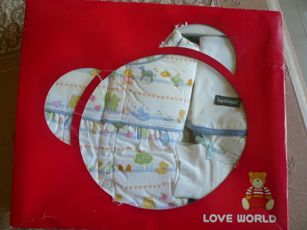 這是我家小朋友出生的時候家人送的彌月禮.只穿過鋪棉連身衣一次.不過因為保存不當.衣服前襟與下擺.有淡淡的黃漬.其他沒穿戴過.不過因為保存不當.有些許黃斑.沒有試圖洗過.不介意的媽咪可以帶回去處理一下.連身衣是厚的.很保暖.今年冬天好冷..快帶回家吧.外盒還在.不過不如新品喔.