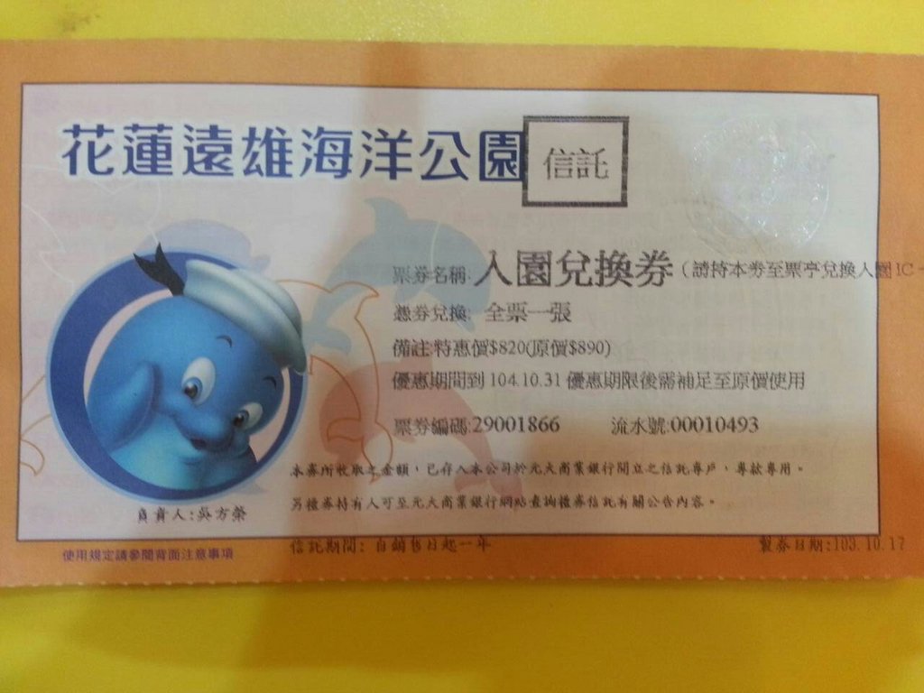 [二手買賣] 大降價!!!賣二張花蓮遠雄海洋公園的票 |