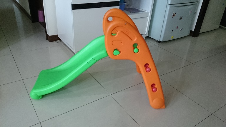 這個溜滑梯一直都是在室內使用的, 最高度約90公分,適合1歳半以上的小朋友玩.