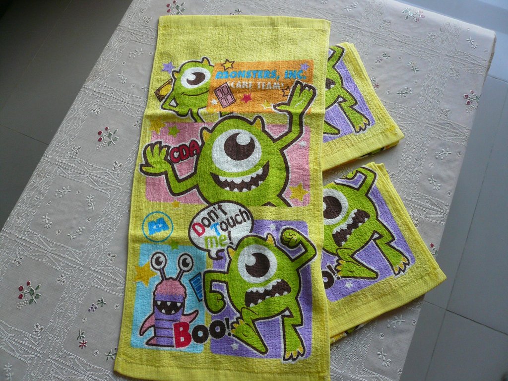 買太多.全部都是剪絨處理的毛巾.很適合小朋友使用.家裡還有其他.這些割愛給需要的人.一條35.三條100.三隻小熊款全新吊牌沒拆.其他吊牌拆掉了.但是全新沒下過水.一直放在櫃子裡.怪獸大學那款標籤車的有點歪歪的..只剩下各一條.要買要快.