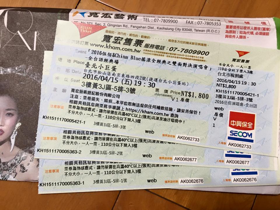[二手買賣] 4月15日,台北小巨蛋(((伍佰演唱會台語場門票三張))) |