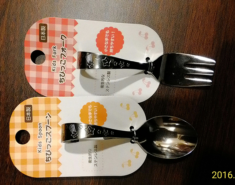 全新圈型把手不鏽鋼日製學習湯匙及叉子,合售100元。