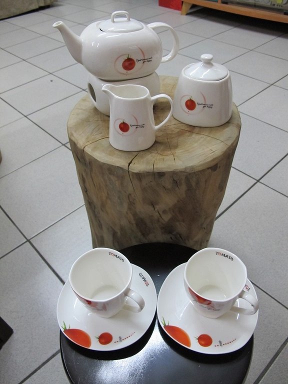 商品敘述:番茄花紋,茶壺底座可放置小蠟燭燒滾,有糖罐、奶壺、杯子杯底盤子各兩個