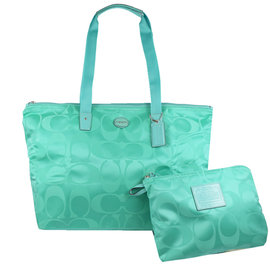 [二手買賣] COACH 時尚Logo祖母綠色緞面織紋肩背大托特包(附收納袋) |