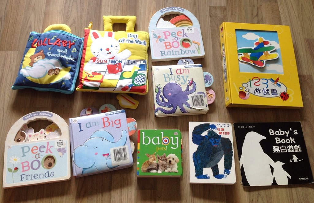 有兩本布書,一本嬰兒黑白書,數本嬰兒啟蒙英文書,一本數字黏貼書