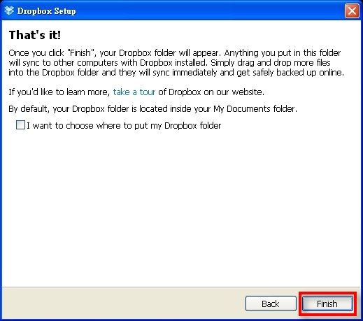 6 X. d+ l* v* l8 @- W4 b m& u▲如果要更改Dropbox的位置只要點選中間的選項在選擇"Finish"即可。. H) L# p& I) ]