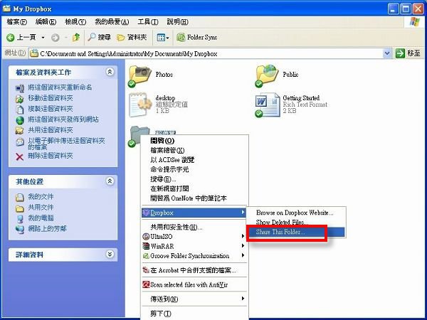 a9 ^5 m3 C1 v$ H% d5 Z# @& ]▲接著只要在該目錄上按滑鼠右鍵選擇Dropbox-->Share This Folder。! e. F& X1 U8 t8 c" R0 o6 X/ q