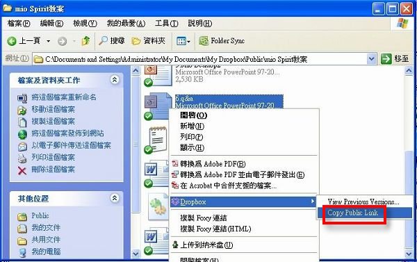 Dropbox甚至可以當私人的FTP使用,只要將檔案放在Public目錄中,然後在該檔案上面按右鍵選擇Dropbox-->Copy Public Link:6 B2 M& O7 m; ~% I$ s' R& q