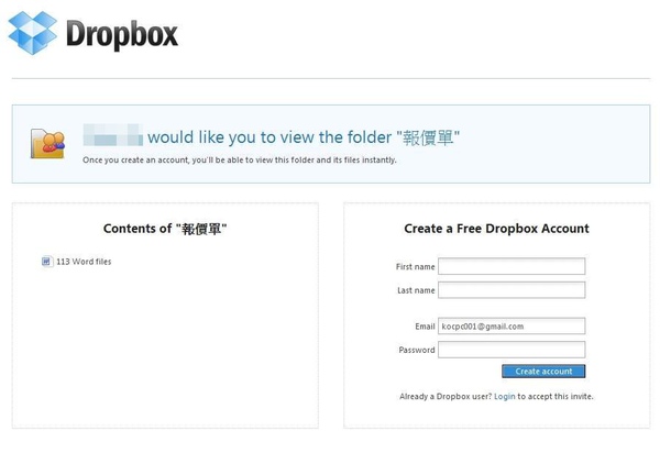 ▲不過你朋友要使用該目錄前也要先註冊一個Dropbox帳號就是了。7 Q# S) x3 n, _( q/ V1 c2 t
