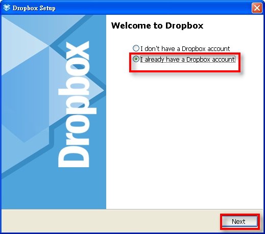 9 ?5 m8 {7 N6 L) J/ ]▲選擇"I already have a Dropbox account"(我已經有Dropbox帳號了),因為剛剛已經在下載前註冊過了,所以直接點"NEXT"(下一步)。. y. g9 w0 r2 Z% {, B