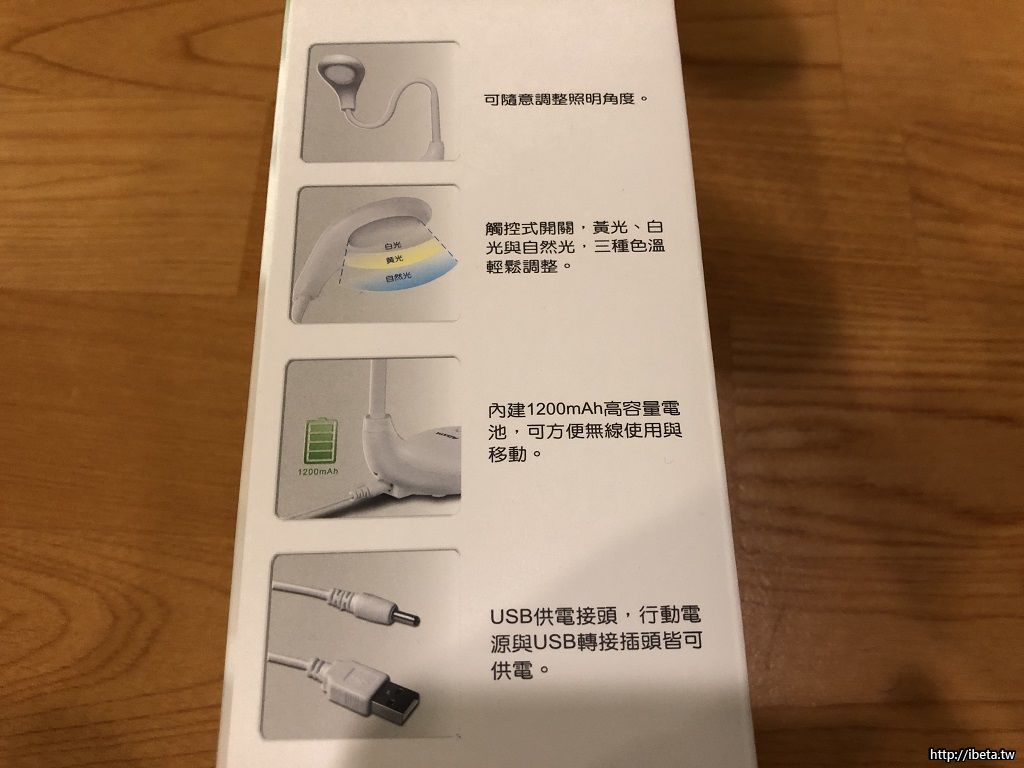 這款可愛的LED檯燈非常方便,有內建電池所以可以隨時隨拿來使用,不需插電。燈管可任意折彎,底座觸碰式開關可以調整三種燈色,適合不同需求。這台8月購入,內含一條USB充電線 (可接電腦或手機充電器充電),看起來有9成新。圖片的彩盒已經不小心弄丟,但充電線還在。