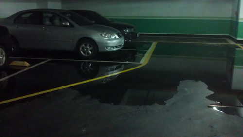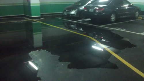 晚上8點多回到社區停車,發現B4停車位由110~114這幾個車位附近積了許多水,當下至大廳轉告物管人員。