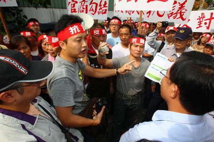 城鄉局昨天到三峽舉辦「三峽麥仔園都市計畫」說明會,當地居民集結抗議。(記者謝佳君攝)