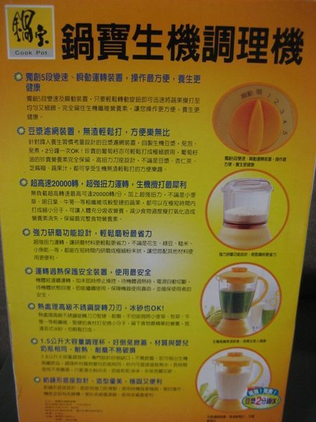 內含主機、調理杯、豆漿濾網、研磨杯;可打豆漿,蔬果汁,冰砂等。
