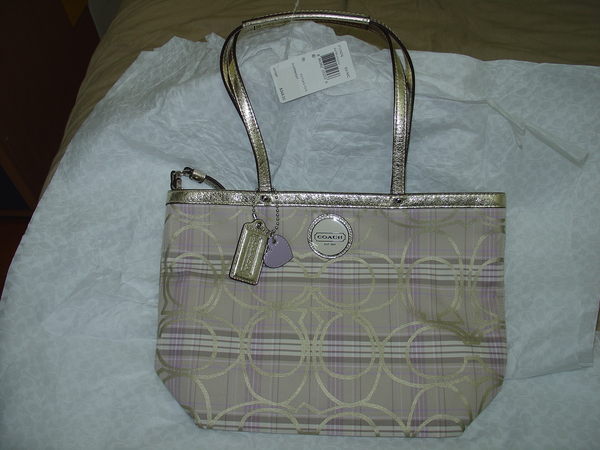 [二手買賣] COACH 金色C-logo格紋金色滾邊手提肩背包-金格紋