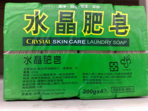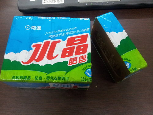 小時候我家裡環境很窮,有時候家裡的洗身體的肥皂用完了,根本沒錢去買,媽媽就會說:不然先用那塊洗衣皂吧~等過兩天爸爸發薪水時再去買,所以呢,我也洗一段水晶肥皂的歲月,而且還每隔一段時間就必須又拿起水晶肥皂來洗。因為當時家裡經濟不好,所以連洗衣機都沒有,因此就必須使用水晶肥皂來洗衣服,後來因為洗衣粉出現了,所以我也洗過洗衣粉(還是白蘭的)。