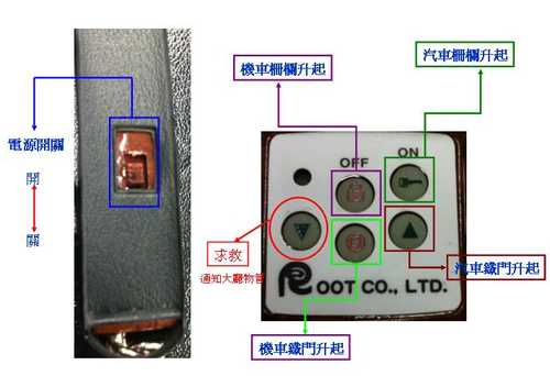 4017# Lily 記位置就好了... 因為我也是這樣, 1.假設你(妳)在B1要出來,面對上坡的車道. 2.遙控器正面對著車道. 3.最右邊上方:控制汽車道柵欄升起. 4.最右邊下方:控制汽車道鐵門升起. 5.中間上方:控制機車道柵欄升 ... 恐龍學長 發表於 2010-7-12 16:20