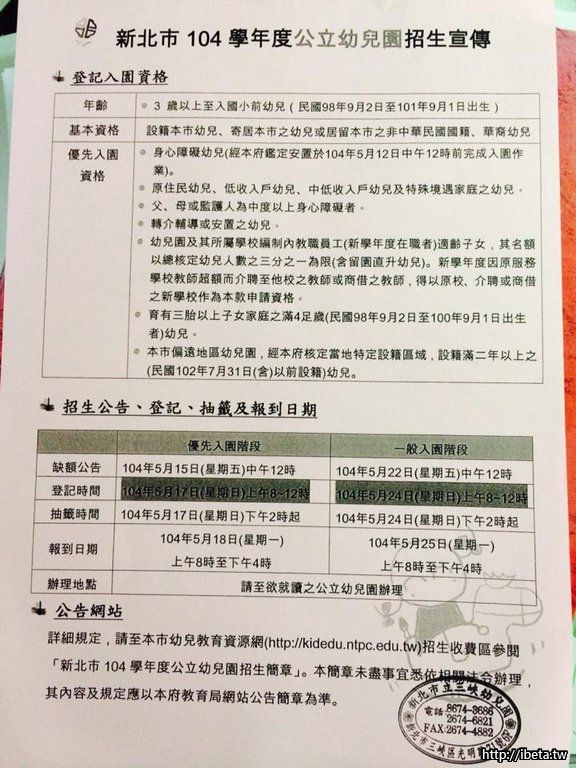 詳細規定請至新北市幼兒教育資源網招生收費區參閲「新北市104學年度公立幼兒園招生簡章」
