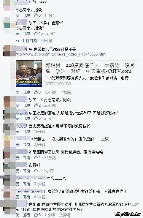 網友對郝龍斌的言論表示不以為然,有多名網友留言:「放下228,勿忘南京大屠殺!」還有人怒嗆「滾回去」,對郝龍斌的發言十分不滿。