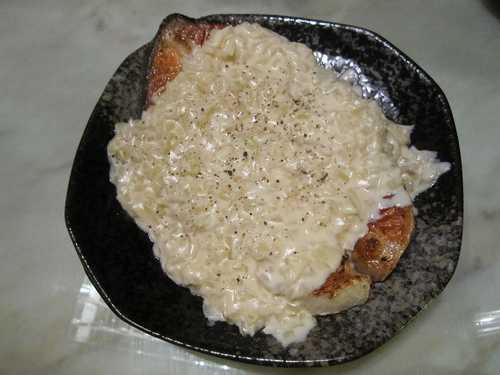 奶油醬鮭魚排: 鮭魚用牛奶浸泡15~20分鐘可有效去除腥味和軟化肉質,撒一點點言和黑胡椒煎熟取出,原鍋奶油炒軟洋蔥碎(也可加菇類)加入些許高湯和牛奶及北海道濃湯塊(也可用奶油炒香麵粉加高湯和牛奶做白醬)及些許鮮奶油及鹽調味淋在魚排上灑點黑胡椒即可,這是一道工續簡單但大人小孩皆宜的騙人菜:P