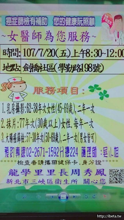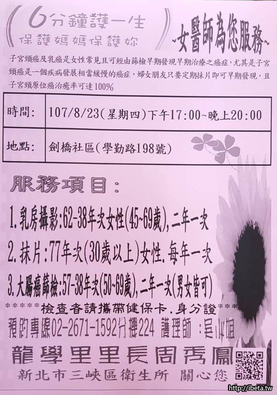 健康篩檢活動,6分鐘護一生,由女醫師為您服務,今天下午17:00至晚上20:00地點:劍橋社區(學勤路198號 ...